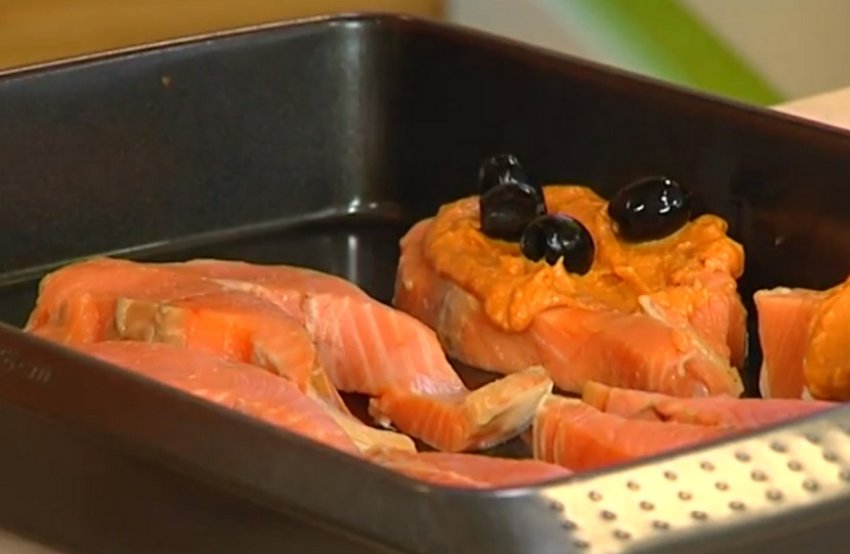 - На дно форми для запікання викласти трохи соусу і розмістити поверх нього стейки кети. Розподілити по рибі соус, що залишився.