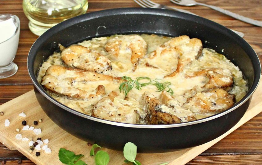 - Викладіть підрум'янену рибу на пательню з цибулею, залийте сметаною і протушкуйте протягом кількох хвилин після закипання. Приправте зеленню.