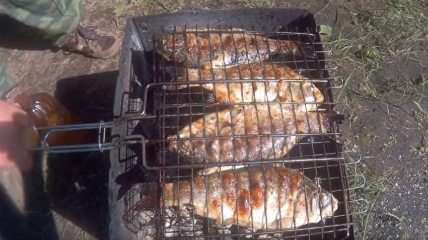 - Щойно з одного боку з'явиться рум'яна скоринка, переверніть решітку. Карасі готуються на сітці 15-20 хв. залежно від розміру.
