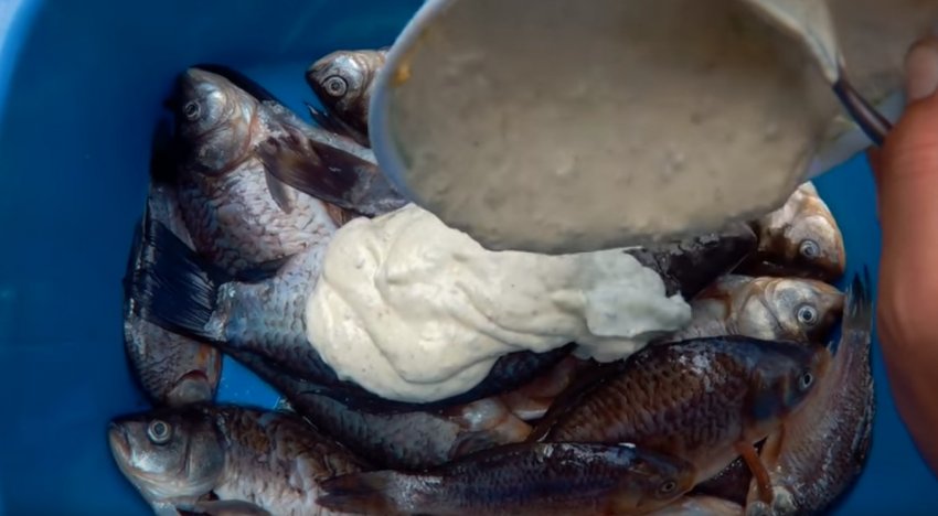 Рибу очистіть і промийте. Майонез змішайте з приправою і натріть рибу зовні та всередині.![]()