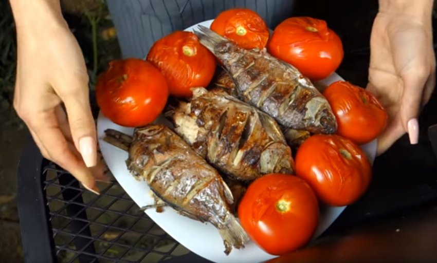 Приправте сіллю, перцем з обох боків. Рибу викладіть на решітку та поставте на вугілля. Засмажуйте 15-20 хв. до рум'яної скоринки, перевертаючи періодично решітку. Окремо запечіть помідори і перець, подайте як гарнір до риби.![]()