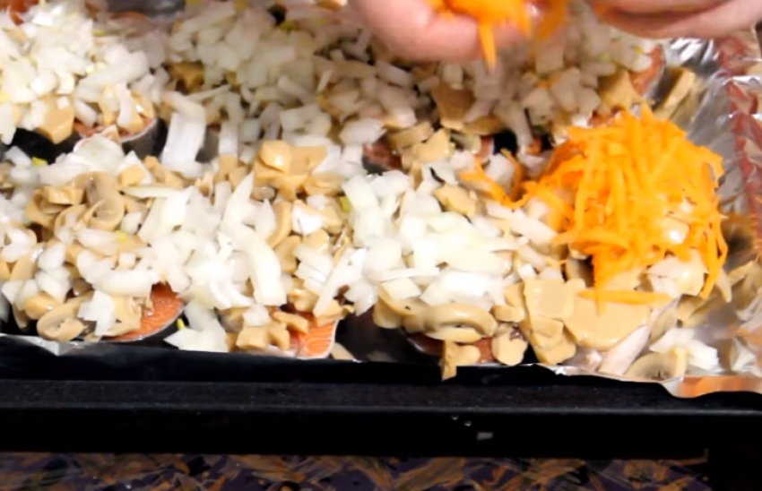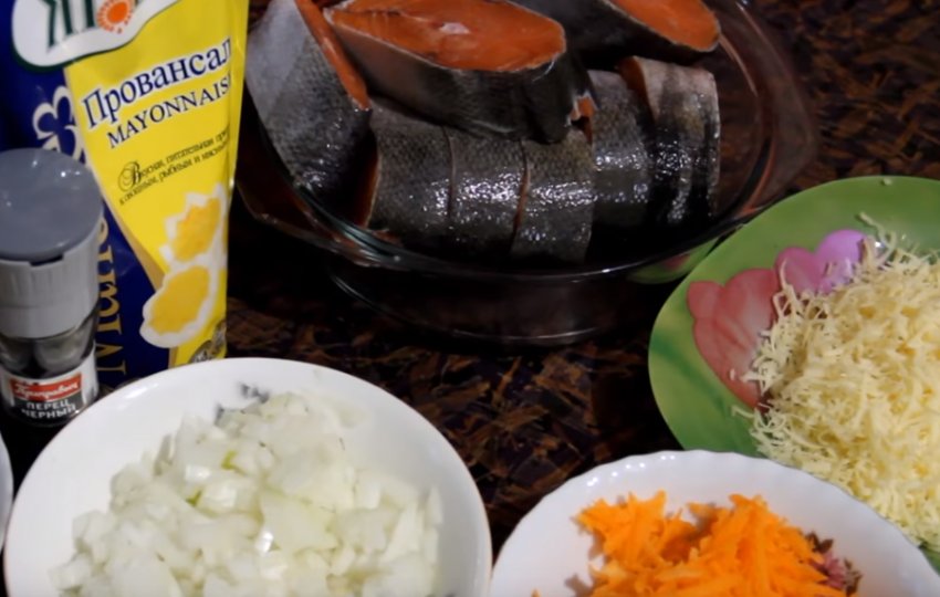 Наріжте рибу на стейки, цибулю - кубиками. Натріть на тертці моркву, сир.![]()