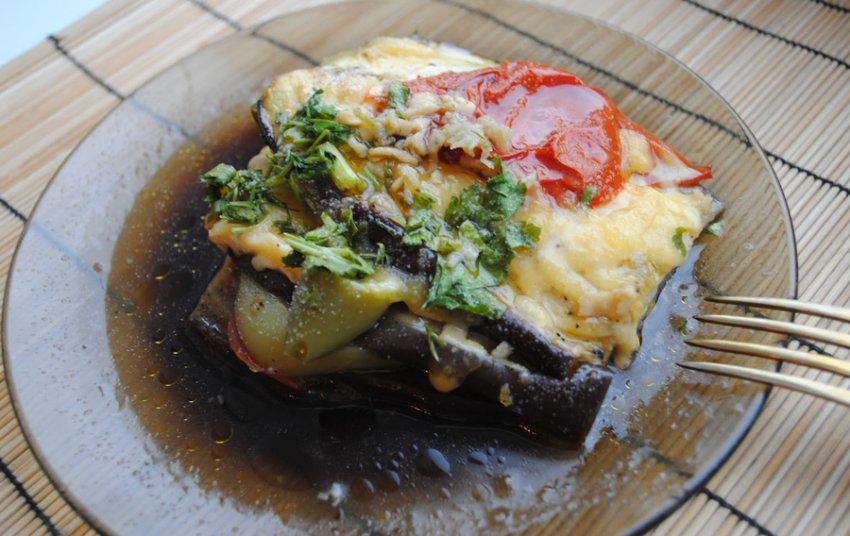 - Скласти в змащену олією форму частину баклажанів, посолити, поперчити. Присипати шар зеленню. Поверх укласти кету і знову посипати зеленню. Висипати смажені овочі та рівномірно розподілити по деку. Залишки баклажанів викласти поверх.
