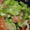 Прикрасити такий простий салат можна за допомогою тих самих інгредієнтів: викласти зверху кружальця з томатів і огірка, а в центрі декорувати листям салату, зробивши з них троянду.