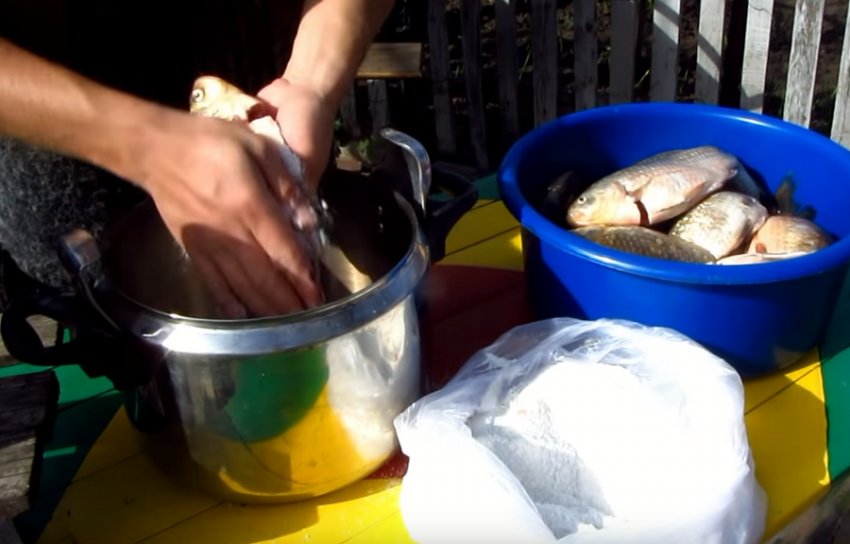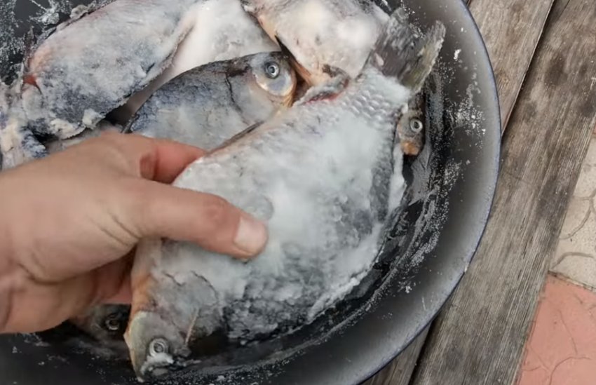 у холодильник на 48 годин, щодня перевертаючи карасів. Після закінчення часу промийте рибу від солі в проточній воді.![]()