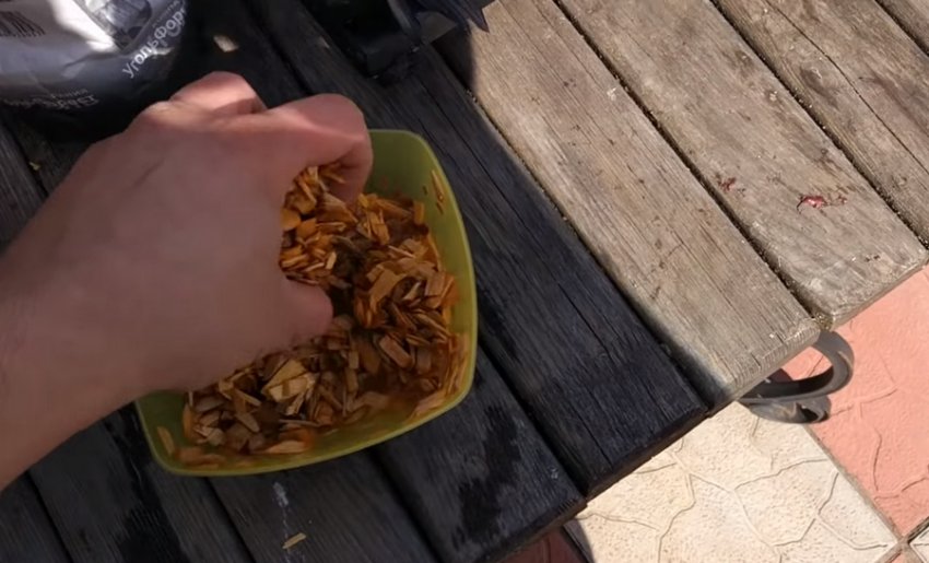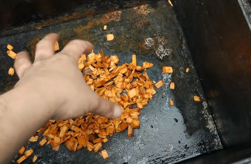 дно коптильні викладіть тріски у формі невеликої гірки, щоб вони довше тліли.![]()