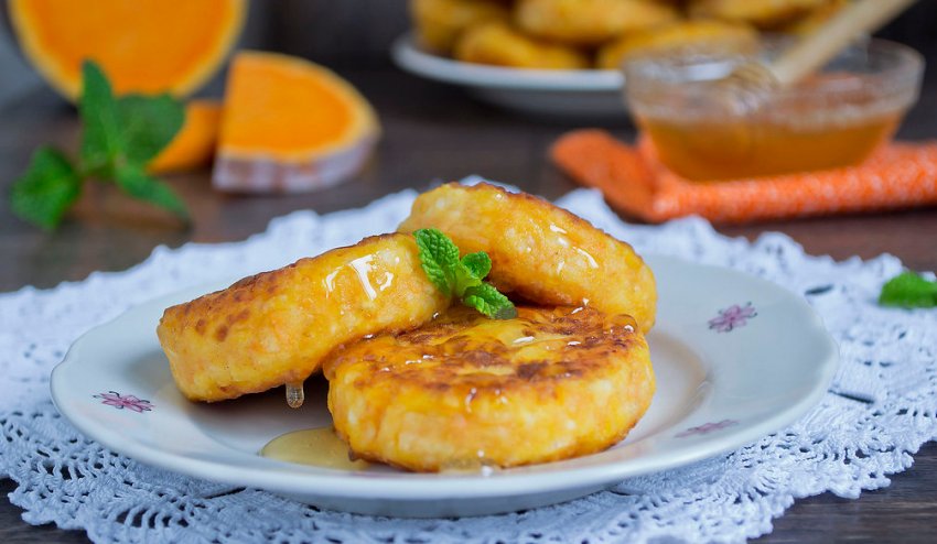 - Сир змішати з яйцем, манкою, сіллю, цукром і гарбузом. Залишити суміш на 20 хвилин.