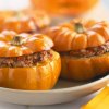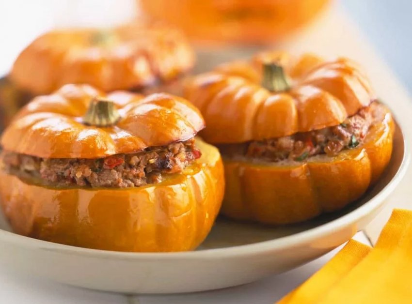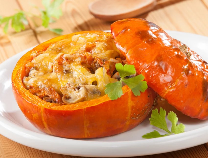 - Овочі приправити сіллю і спеціями, перемішати, перекласти в горщик із гарбуза, влити овочевий бульйон, закрити кришкою з верхівки гарбуза