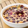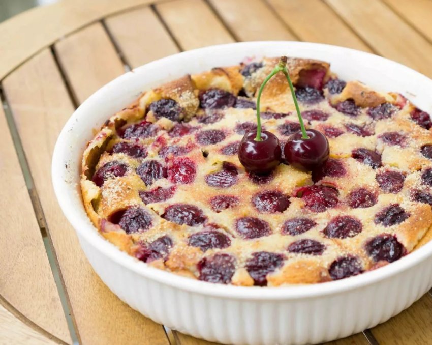 - Форму для запікання змастити олією. Влити половину тіста, викласти вишню, влити другу частину тіста.