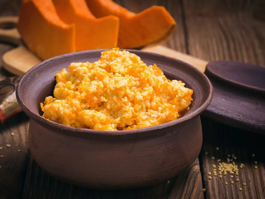 - Всипати в каструлю крупу, гарбуз, влити воду, посолити. Варити до готовності.