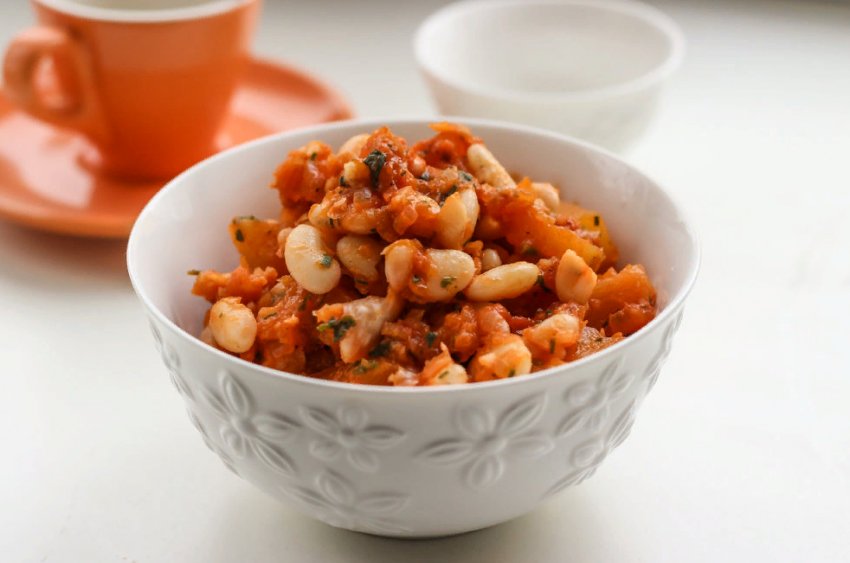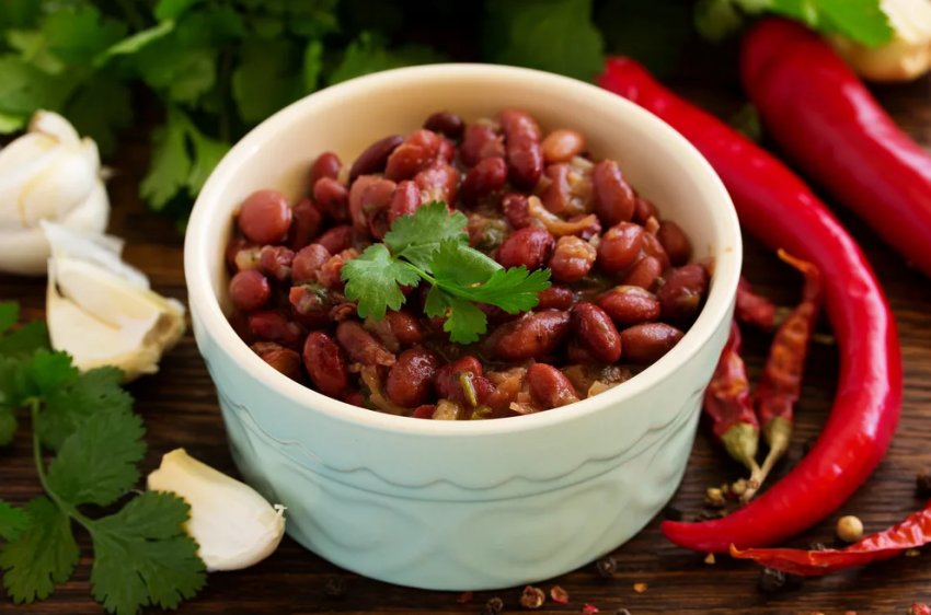 - Цибулю і перець обсмажити на рослинній олії, додати томатний соус, квасолю, посолити, приправити спеціями, влити склянку води. Тушкувати до готовності.