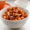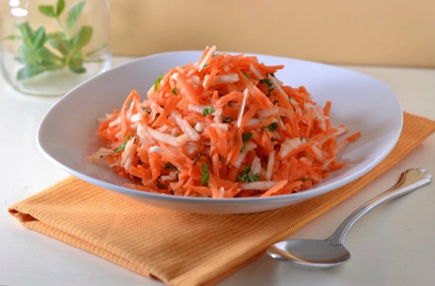 - Змішати квасолю, огірок і моркву, тертий імбир, подрібнений часник, заправити соком лимона, олією і соєвим соусом. Присипати кунжутом.