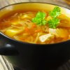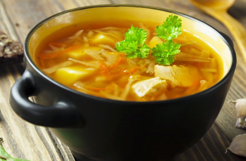 - Закип'ятити бульйон, всипати в нього картоплю, нарізану кубиками, і нашатковану капусту.