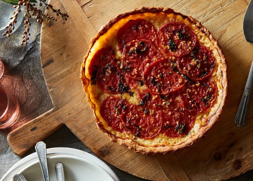 - Наріжте помідори на часточки і розкладіть поверх розплавленого сиру.