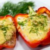 - Викладаємо на тарілку плотики з перцю і наповнюємо їх сирною масою.