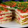 - Нарешті, кладемо четвертий корж, змащуємо соусом і прикрашаємо беконом (можна додати помідори тощо).