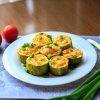 - Починаємо заповнювати наші бочки. Накладаємо трохи фаршу і кладемо колечко помідора. Чергуємо до заповнення кабачка.
