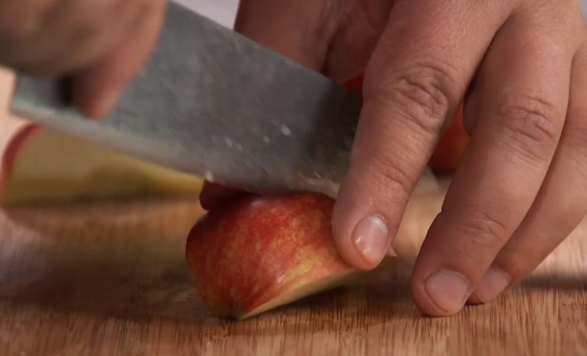 - Помити яблука, зрізати шкірку і вирізати серединку. Нарізати невеликими кубиками 1×1 см.