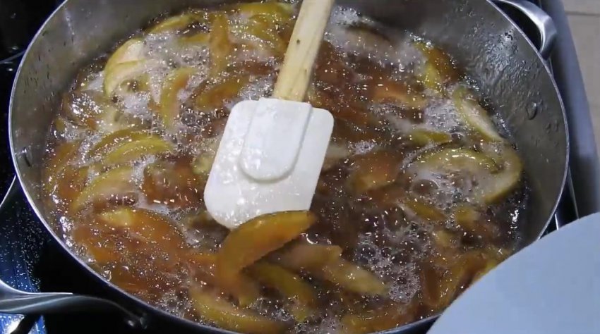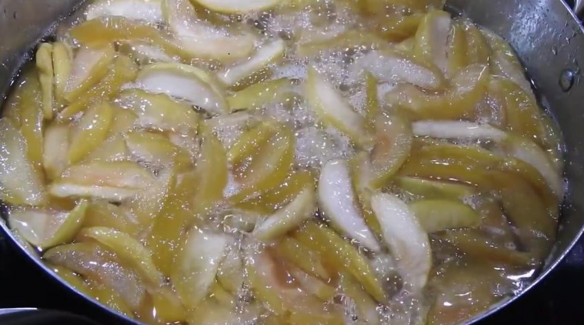 - Помістити плоди в сироп. Тушкувати 30 хвилин. Усе має добре вирувати. Для перемішування просто струсіть каструлю круговими рухами. Слідкуйте за цілісністю фруктів.