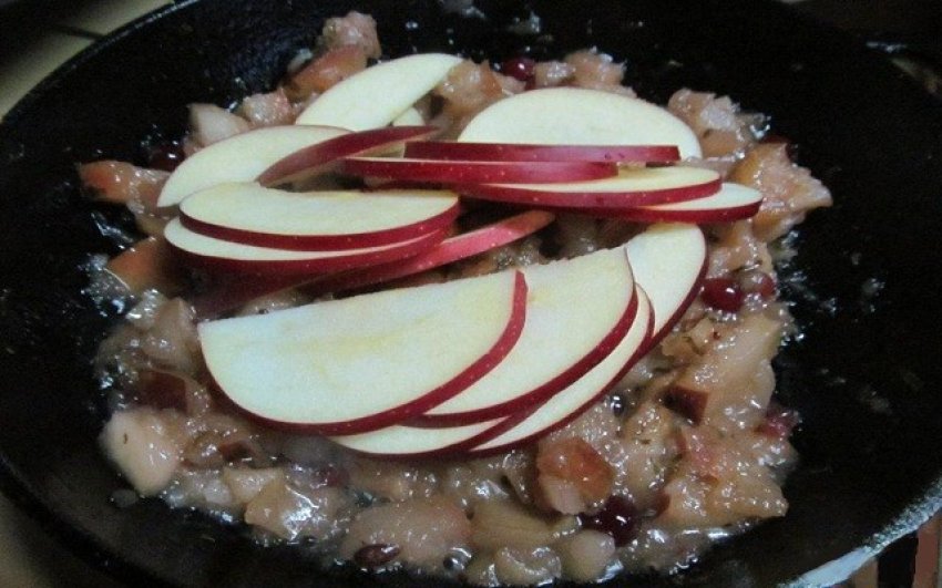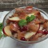 Це найшвидший рецепт. Слід підготувати фрукти - вимити, нарізати 2 шт. кубиками. Помістити в каструлю шматочки плодів та інші інгредієнти - журавлину, оливкову олію, дрібно нарізану м'яту, цукор, сидр, кленовий сироп. Як варіант, сироп можна замінити на будь-який інший або зовсім не додавати.![]()
