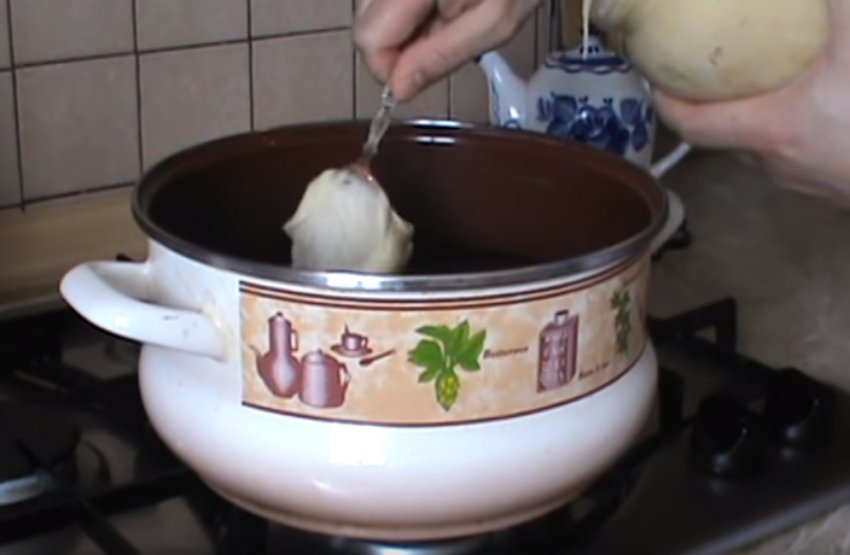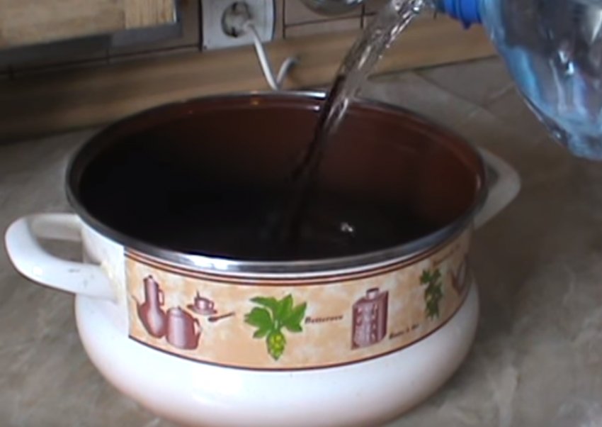 - У велику емальовану ємність залити воду, закип'ятити і зменшити вогонь.