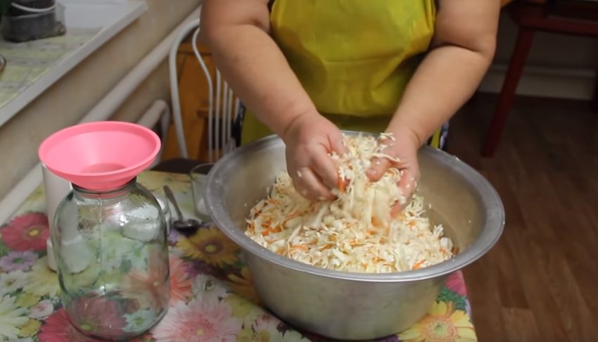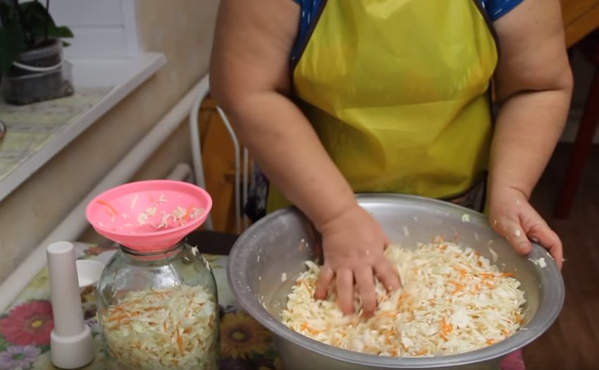 - Натерти на тертці, використовувати краще великі комірки, попередньо очищену і вимиту моркву. Висипати до основних інгредієнтів і ретельно перемішати. М'яти суміш овочів повторно не треба. Солона капустяна рідина, яка вже є в ємності, сприяє виділенню морквяного соку.
