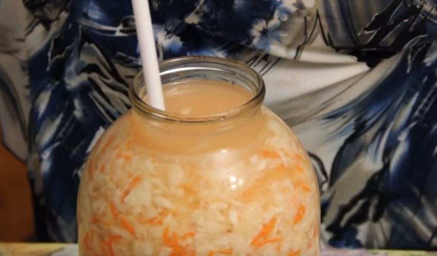 - Наповнену банку поставити в глибоку миску й залишити в теплому, темному місці на 72 години. У цей час важливо 3-4 рази на день довгою дерев'яною шпажкою протикати вміст банки до самого дна, даючи можливість газам, що утворилися, вийти на поверхню. Піну, яка накопичується зверху, краще знімати. А за недостатньої кількості соку (він має покривати капусту повністю) доливати тим, що зібрався в мисці.