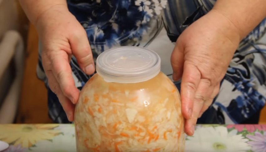 Капусту придавити пластиковою перевернутою кришкою, яку необхідно, попередньо склавши навпіл, засунути всередину банки. Вона перешкоджатиме підняттю капусти над розсолом. Зверху можна поставити пляшку або склянку з водою, які придавлюватимуть нашаткований овоч.![]()