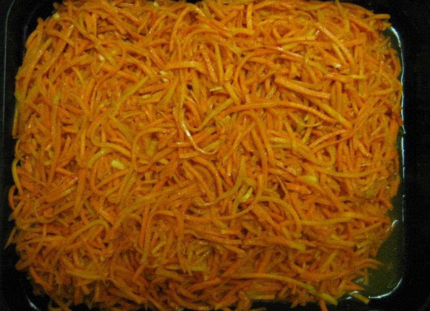 - Натріть чисту моркву на крупній тертці, помістіть у широку місткість і перетріть із сіллю.