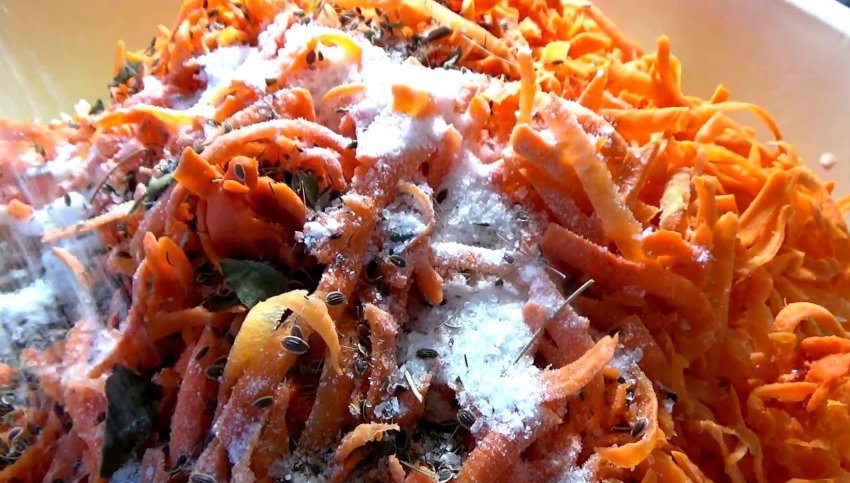 Моркву почистити від шкірки. Нарізати тонкою соломкою. Овочі скласти в миску, перемішати з сіллю.![]()