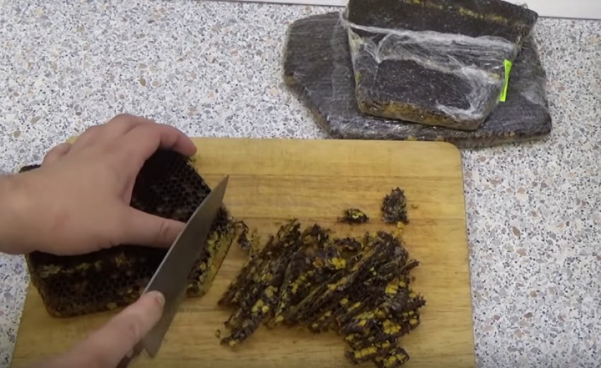 Порізати ножем стільники з пергою на невеликі шматочки у вигляді вузьких тонких смужок і кинути в медову воду. Усе добре перемішати.![]()