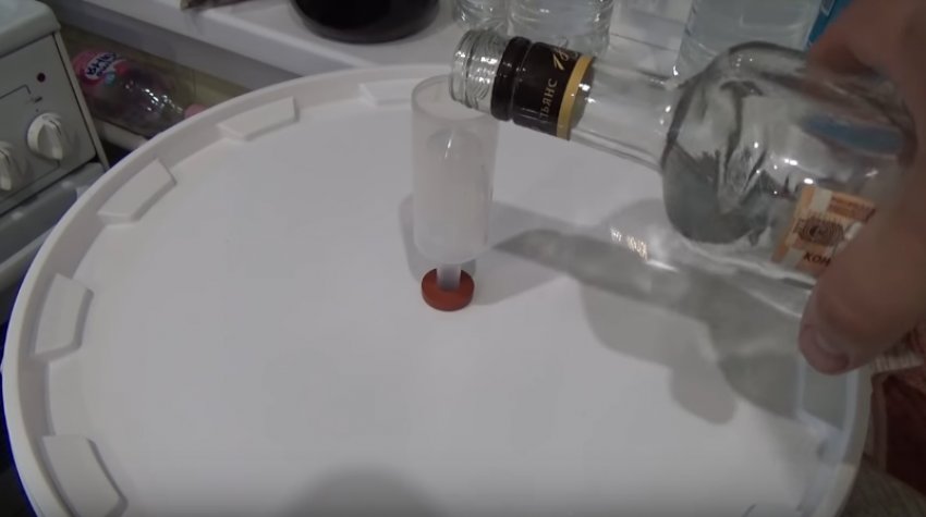 Ферментор із розчином закрити водяним затвором, але замість води в гідрозатвор ллємо міцний дистилят, щоб уникнути потрапляння всередину бактерій.![]()