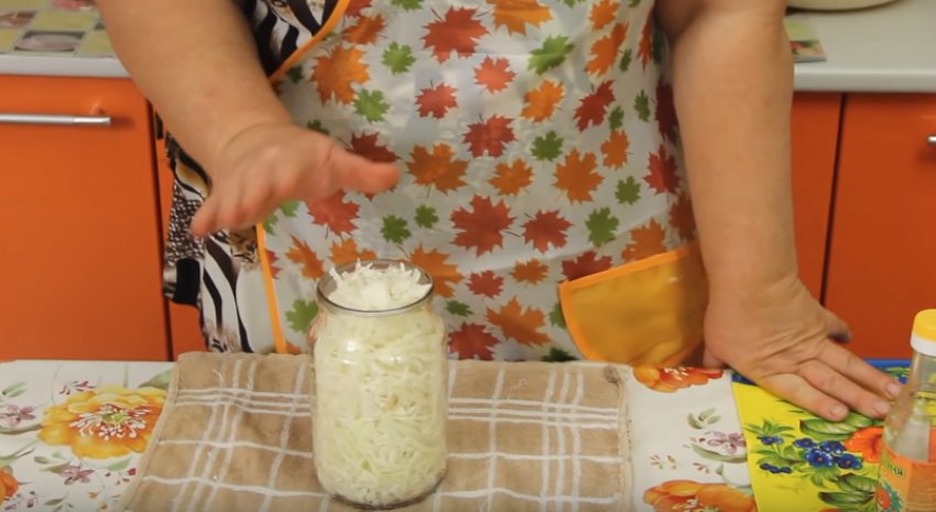 Наповнити стерильні банки нашаткованим овочем доверху, злегка ущільнюючи.![]()