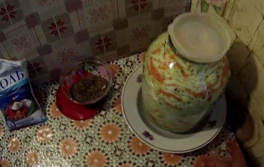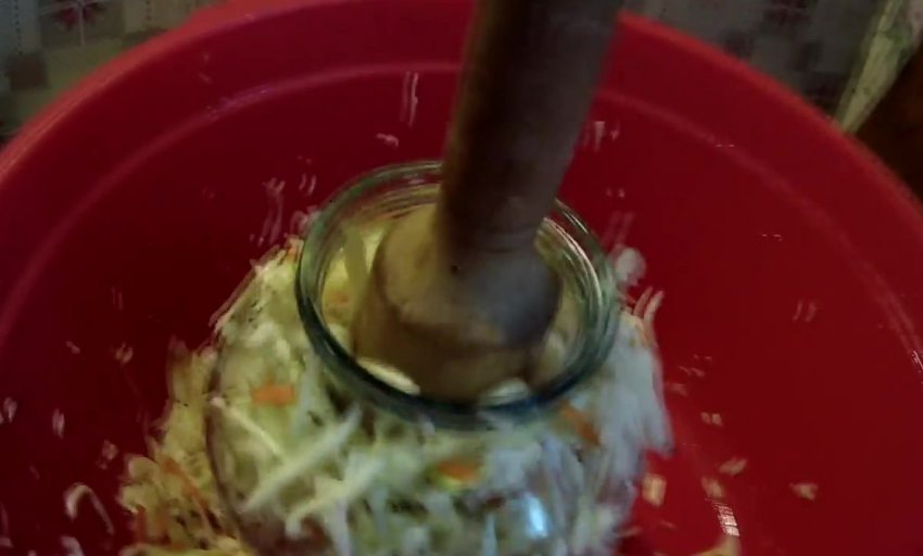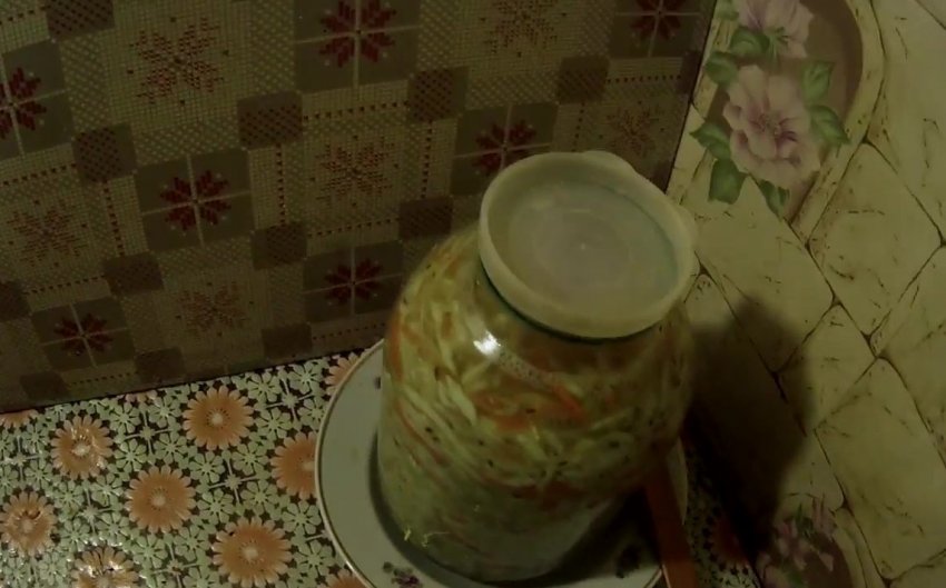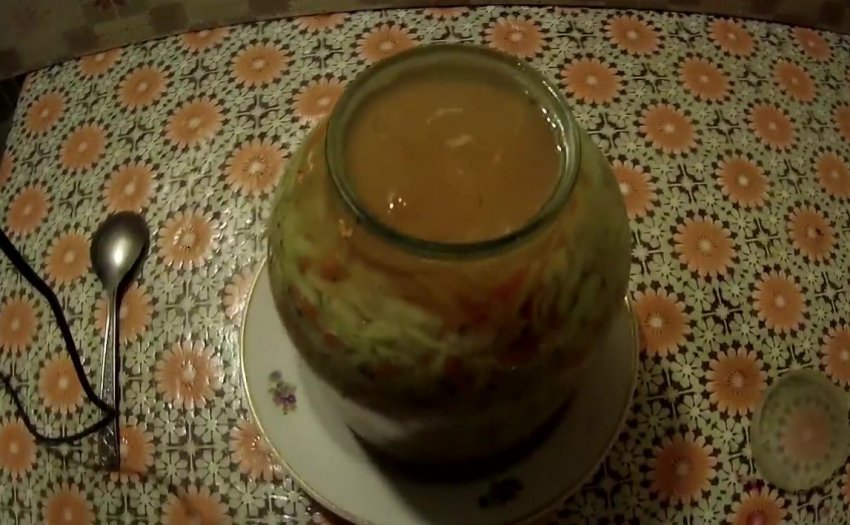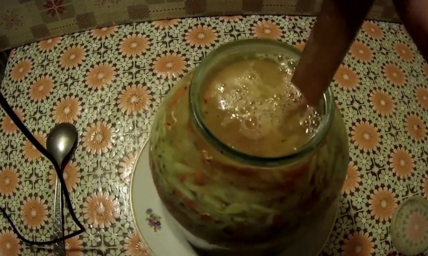 Засолювання проводиться при кімнатній температурі. Наступного дня треба проколоти закваску, щоб зайві гази вийшли. Проколоти можна за допомогою зворотного боку ополоника або дерев'яною китайською паличкою.![]()