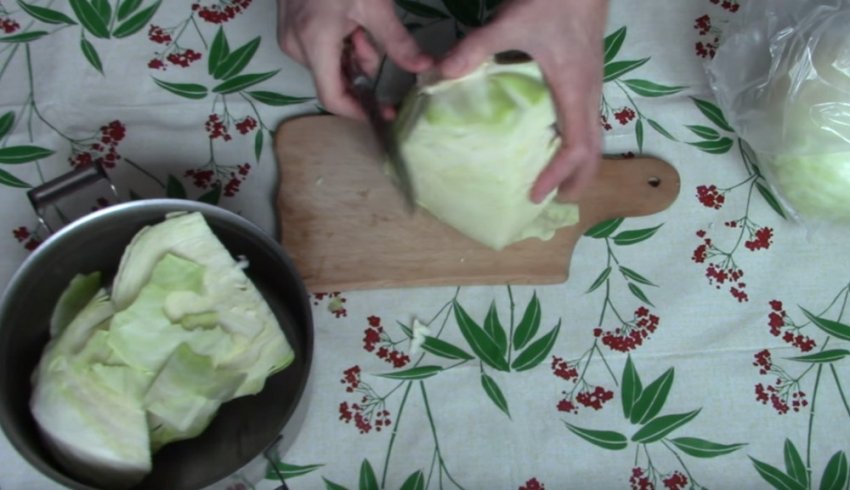 З овоча знімають верхні листки, качан розрізають на кілька частин, після чого якомога тонше шаткують за допомогою ножа або шатківниці.![]()