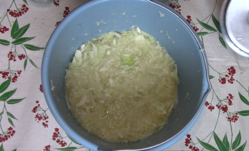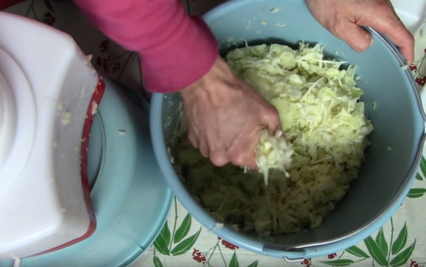 Нашаткований овоч, пересипаний у підготовлений посуд (каструлю або відро), слід добре вимішати, паралельно трохи придушивши та пом'явши.![]()