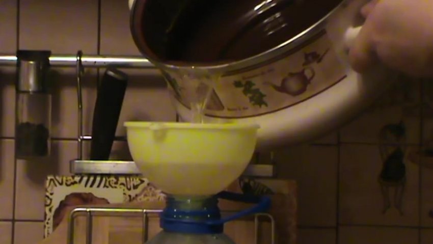 - Коли бражка визріє (це легко визначити за піною, яка в деяких місцях починає опадати), її необхідно процідити. Макуху, що залишилася, викласти в марлю, зав'язати у вигляді мішечка для подальшого використання.