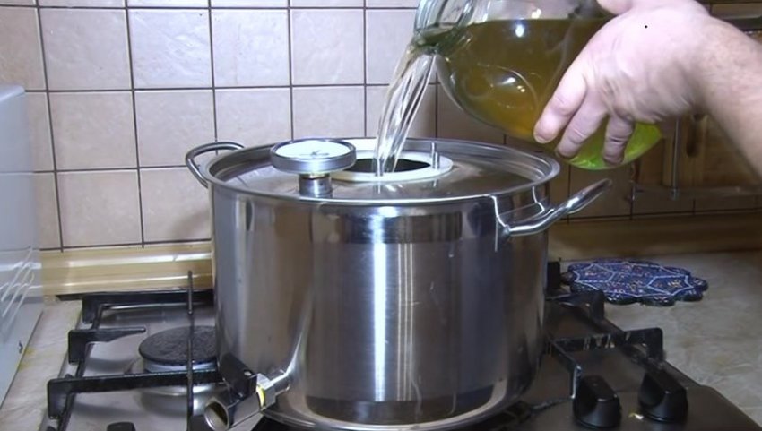 - У куб перелити брагу, підвісити марлю з макухою і швидко нагріти до +75...+80°С.