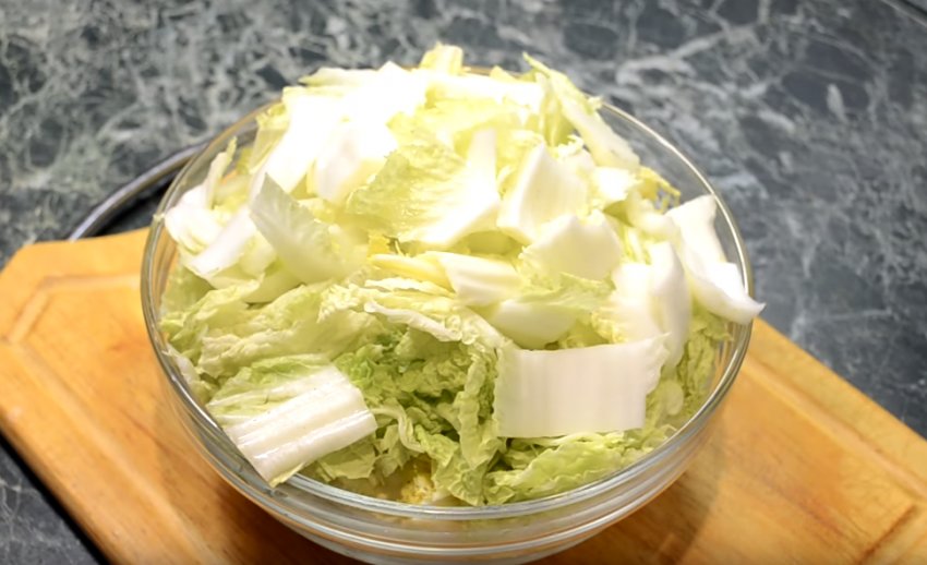 - Пекінку порізати невеликими шматками, трохи відварити.