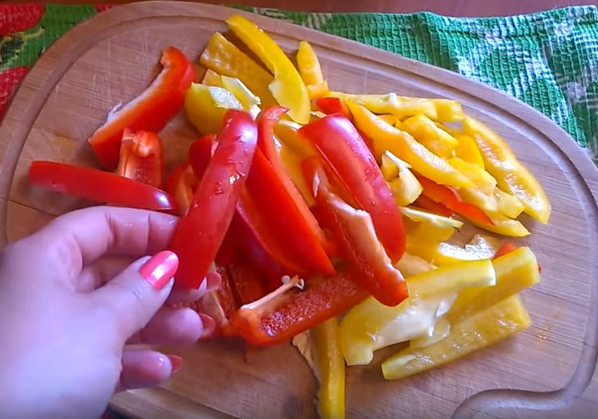 - Перець промити, звільнити від насіння, нарізати смужками.