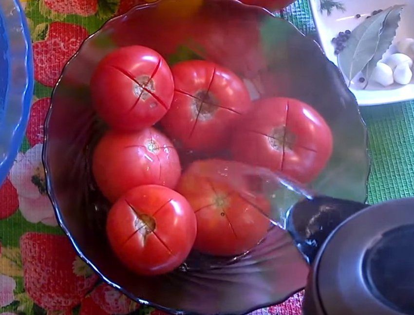 Томати промити, ошпарити окропом, зняти шкірку.![]()