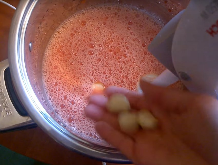 - У томатну суміш додати соняшникову олію, часник, сіль, цукровий пісок, довести до кипіння. Кип'ятити на маленькому вогні близько 5 хвилин.