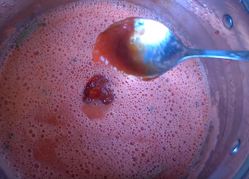 - У велику каструлю влити томатний сік, додати цукор, сіль, олію та оцет. Суміш перемішати, довести до кипіння. Кип'ятити протягом 10 хвилин на невеликому вогні.