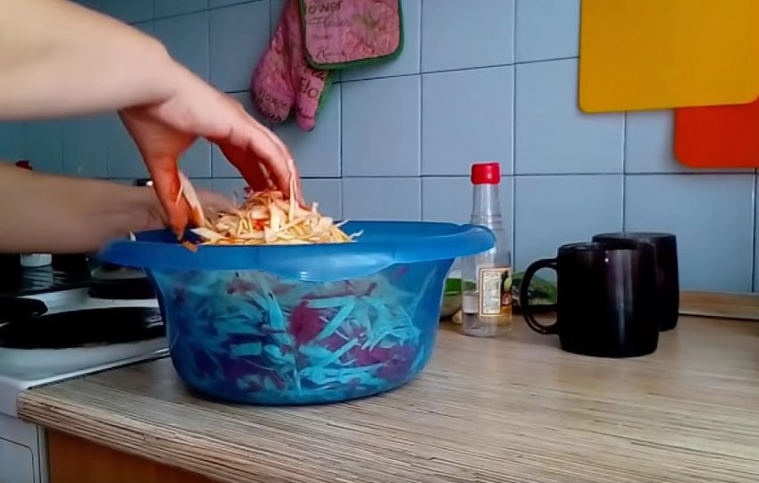 - Перетерти капустяну нарізку до появи соку.