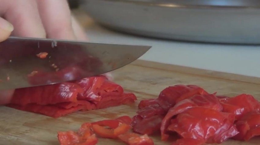 Із перцю прибрати внутрішні камери, порізати півкільцями завтовшки 5 мм.![]()