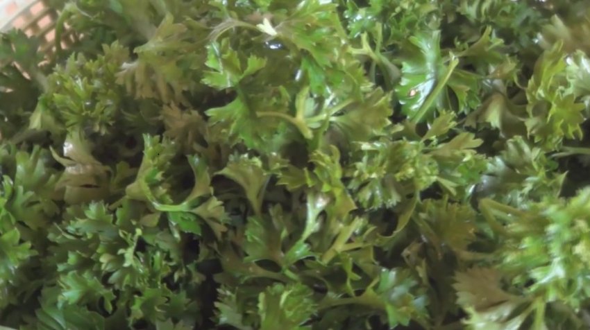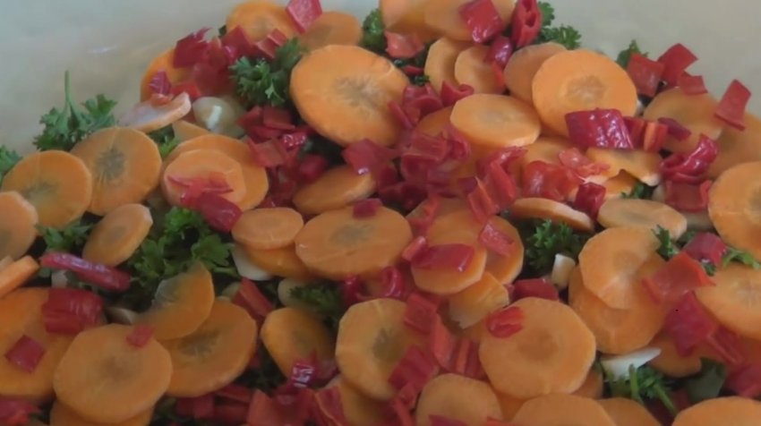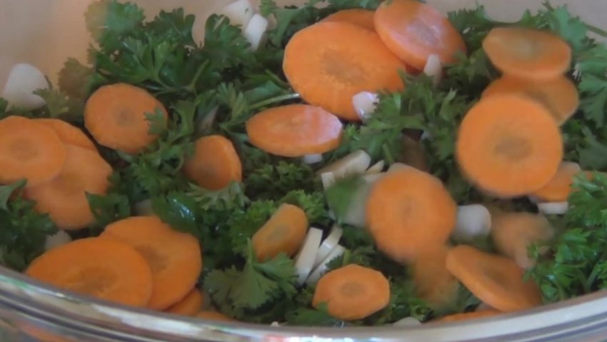 Укласти в одну ємність овочеву нарізку із зеленню в такій послідовності: петрушкові листки, часник, моркву, півкільця перцю, капустяні суцвіття.![]()