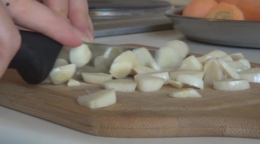 Зубці часнику порізати шматочками товщиною по 5 мм.![]()