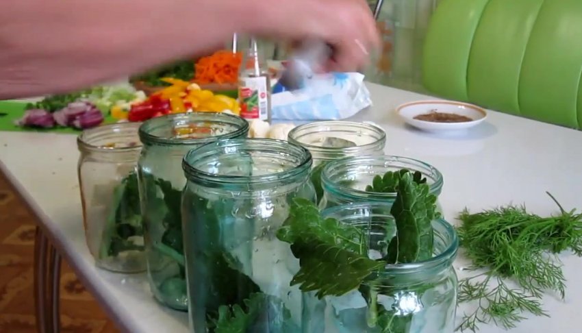 У простерилізовану тару помістити по листку хрону з лавровим листком, запашним перцем, кільцями цибулі, часниковими часточками, кроповим насінням, цибулею-пореєм, зеленню.![]()