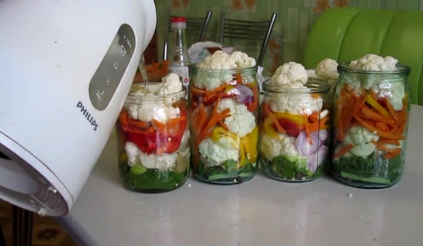 Закласти капустяні суцвіття, моркву, солодкий перець.![]()