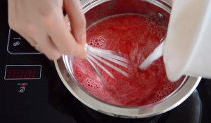Засипати цукор з пектином у підігрітий сік, помішуючи вінчиком. Продовжуючи мішати сік із цукром, довести суміш до кипіння і вмішати глюкозний сироп.![]()